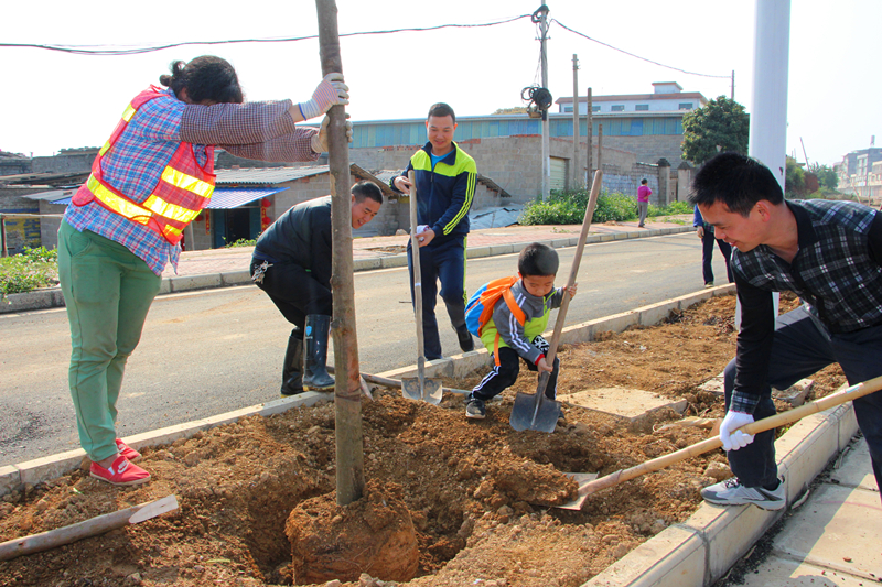 随后,大家开始植树,你来扶苗木,我来填土,他给新种的苗木钉固定架;大手小手一起给新种的树苗浇水,场面热火朝天,紧张有序…………