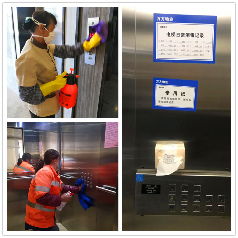 防疫物资到位后,万方公司于1月30日及时安排人员将物资下发到各服务项目,同时在接管的绿港·国际中心、丽汇工业园、创意产业园、金凯工业园、银凯孵化园、宏象工业园、现代工业园、吴圩新港家园等10余个项目全面开展疫情防控工作。由各项目主任带头领导,多措并举防控疫情。首先,对公厕、下水道、单元楼道、垃圾桶、绿植等容易滋生病菌的场所进行消毒,重点对人员接触频繁的电梯、公共通道的门把手、开关、按键、健身器材等位置进行每日1-2次的消毒灭菌工作。其次,严格落实园区进出人员及车辆的管理和登记,共在各园区设置定点体温检测10处,严格开展入园人员体温检测,并进行体温异常人员登记,除现场进行体温检测外,还在万方公众号小程序上推送各种防疫工作温馨提示,提醒业主注意防疫措施并配合体温监测。再次,设置废弃口罩回收点30个(每个园区视项目情况配2-3个点),回收废弃口罩,防止病毒逸散。最后,深入园区,做好业主和群众的疫情防治宣传,在各园区共悬挂疫情防控宣传横幅50条,将防护知识传播到各家各户,降低恐慌,为共同保障园区环境奠定良好的群众基础。