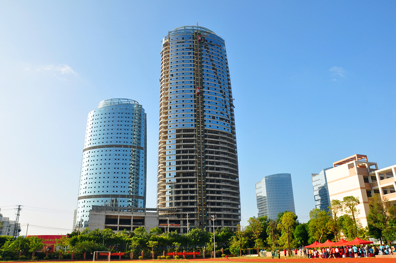 《建设中的绿港国际中心》(荣鑫公司 赵志业)图片说明:绿港国际中心正在做外墙玻璃装饰施工,在阳光的照耀下美丽而雄伟。球场上的运动员意气风发。预示着华体会平台充满活力。
