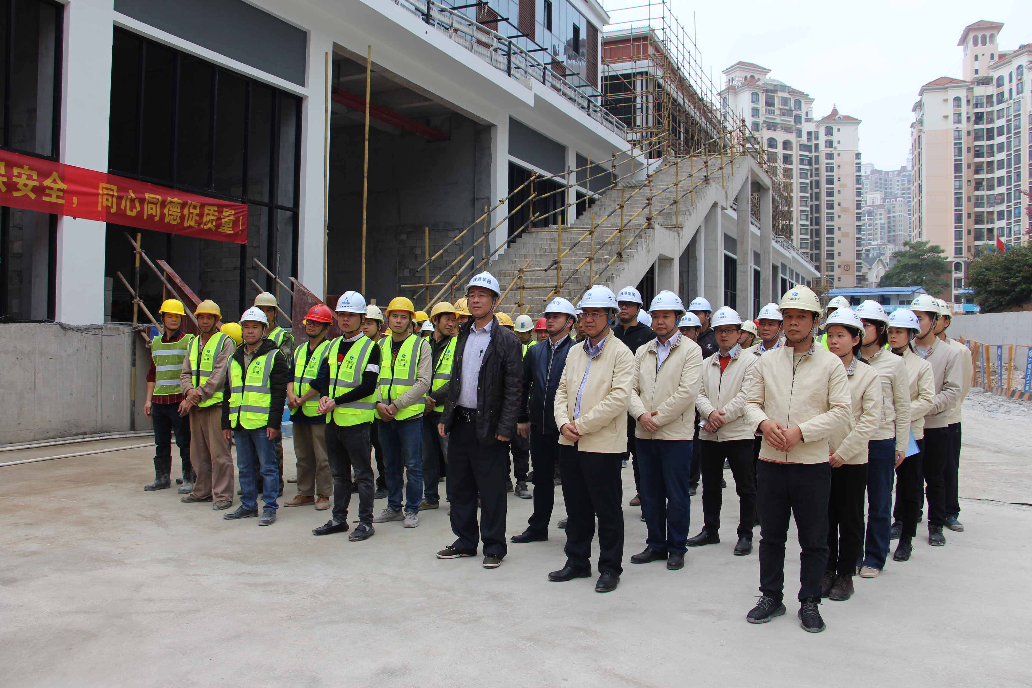 为全力确保工期目标顺利实现,12月29日,绿港·欢乐里项目举行“奋战30天,确保绿港·欢乐里项目竣工交付”誓师大会,华体会平台副总经理、嘉通公司总经理傅杰锋、嘉通公司副总经理何小勇,嘉通公司工程一部相关人员、项目建设单位代表、项目监理单位代表及劳务队组代表参加了活动。