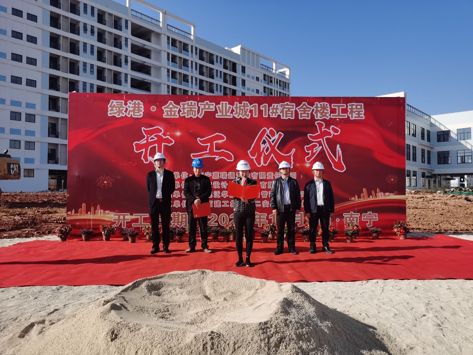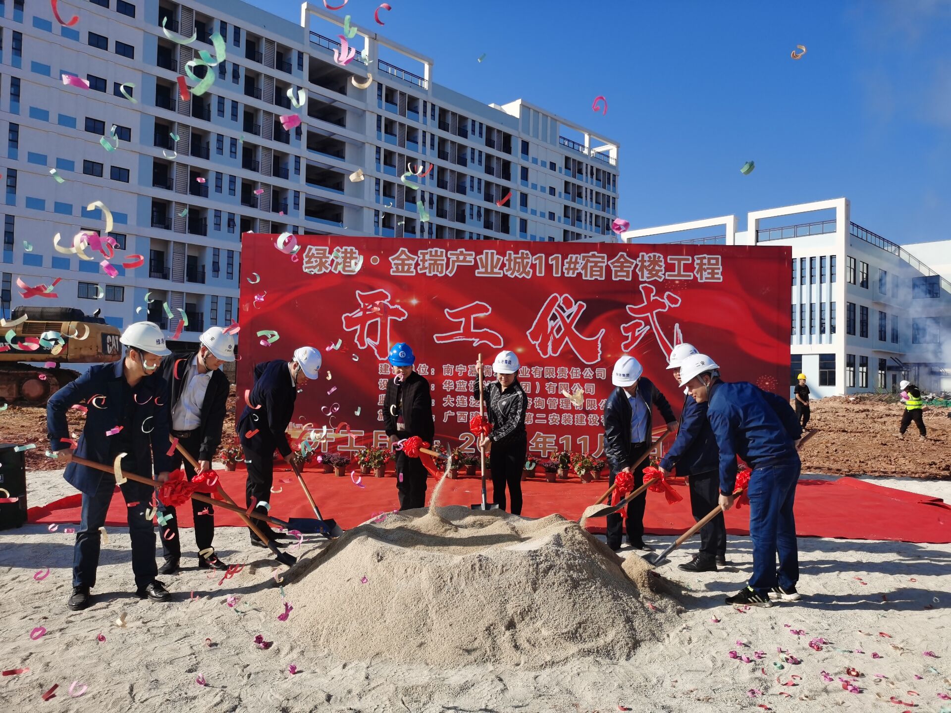 绿港·金瑞产业城项目位于南宁经开区高岭路南侧、金阳路西侧,占地245亩,总建筑面积406039.74㎡,总投资约13亿元。项目包括17个单体建筑,分三期建设,一期约6.1万㎡;二期约14.8万㎡;三期约19.7万㎡。目前,项目一、二期工程正如火如荼建设中,一期工程除16#污水处理厂房外,其他全部单体已拆除外架,计划于2021年12月完工;二期工程全部单体将于11月完成主体封顶,计划在2022年1月完工。本次开工建设的11#宿舍楼工程拟建设1栋9层宿舍楼及其他附属配套设施,建筑面积18129.06㎡,计划于2022年10月交付。