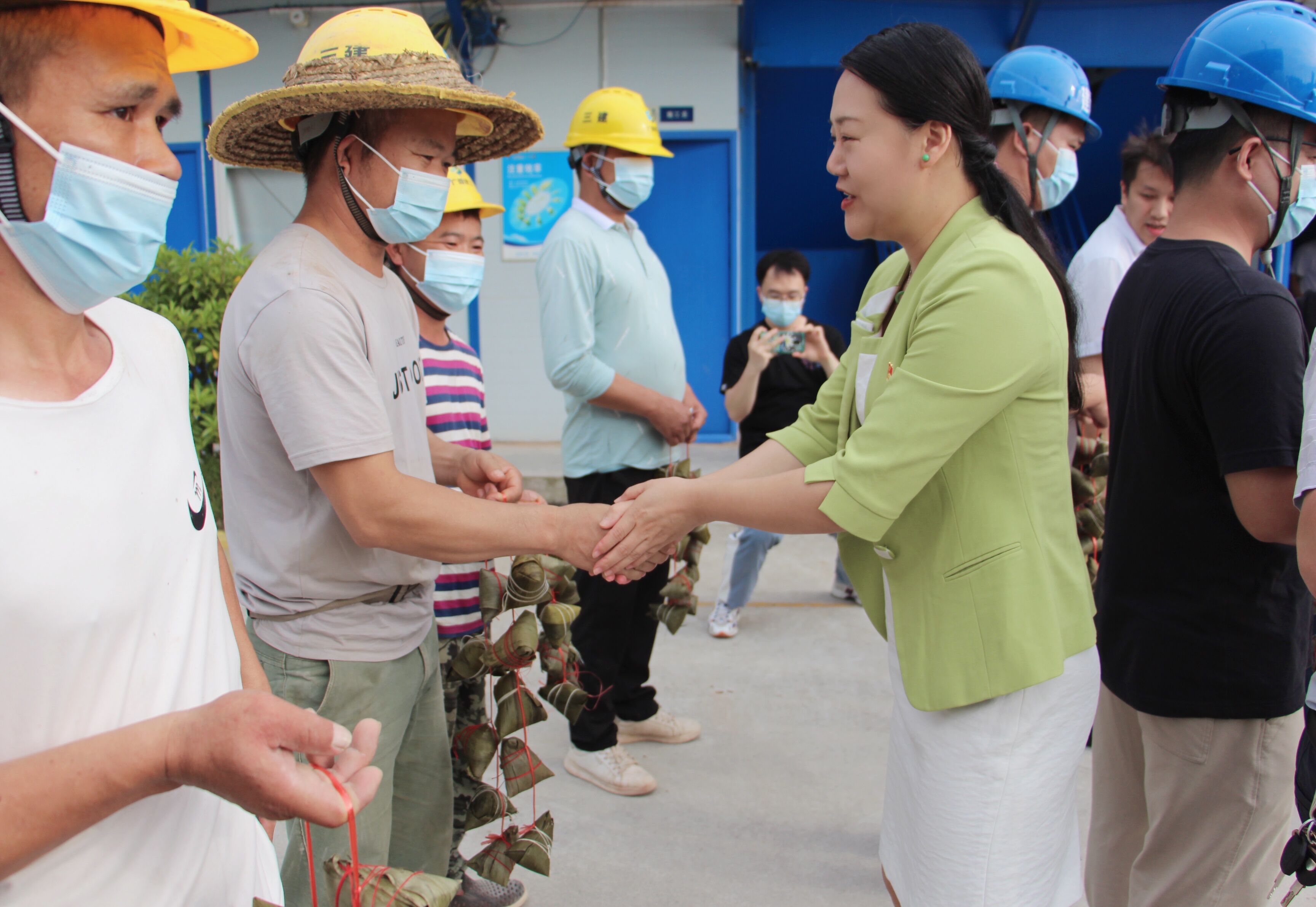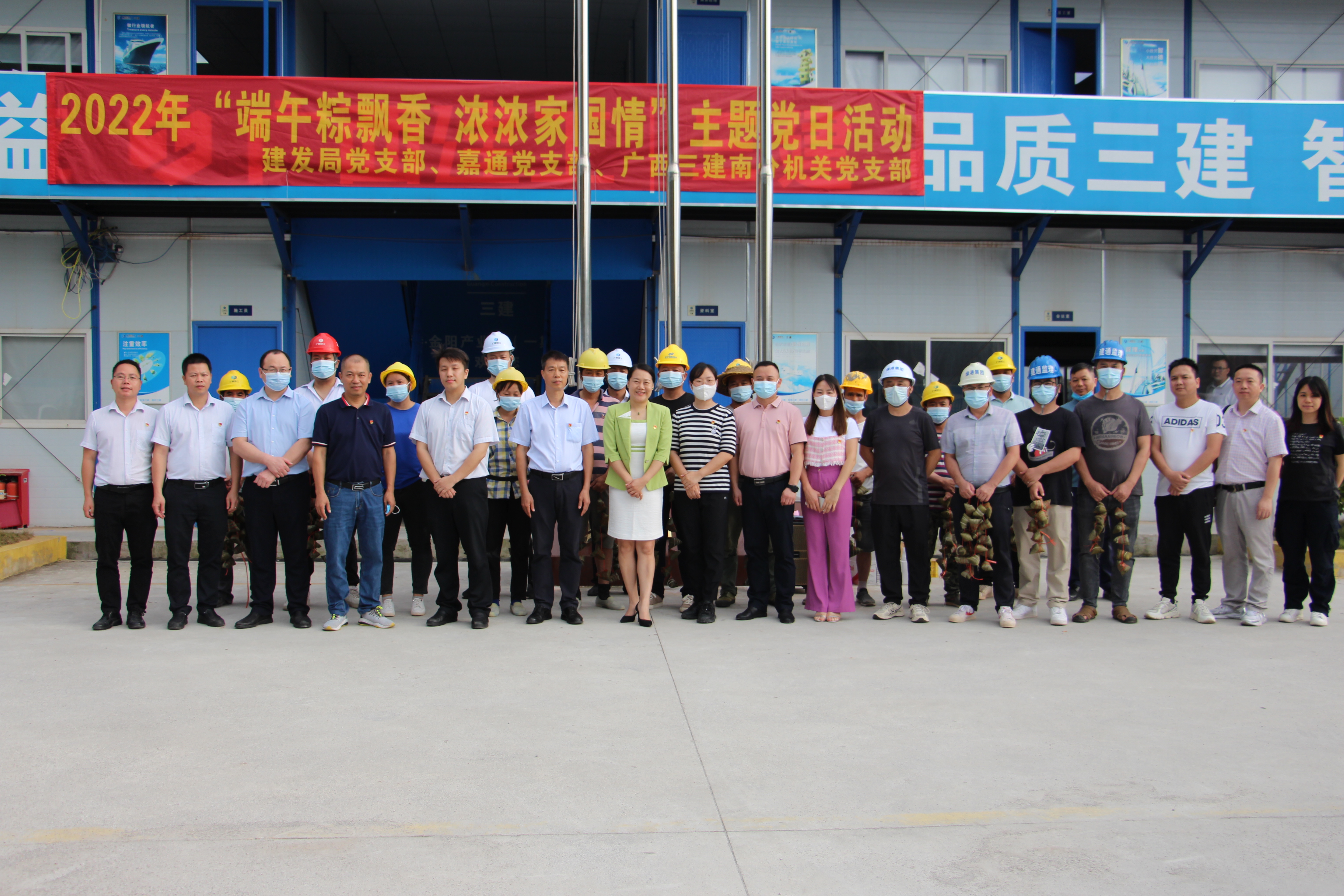 荷月繁花似锦来,粽米飘香温情至。端午佳节将至,为进一步传承中华民族传统文化,深入挖掘端午节的文化内涵,增强文化自信,弘扬新时代爱国主义精神,涵养广大党员的家国情怀,6月1日,嘉通公司党支部联合经开区建设发展局党支部、广西三建南分机关党支部深入绿港•金阳产业城项目开展2022年“端午粽飘香 浓浓家国情”主题党日活动,为项目一线工人送去粽子等慰问品以及节日问候。华体会平台党委委员、副总经理、嘉通党支部书记黄丽琴以及嘉通公司党支部全体党员参加活动。