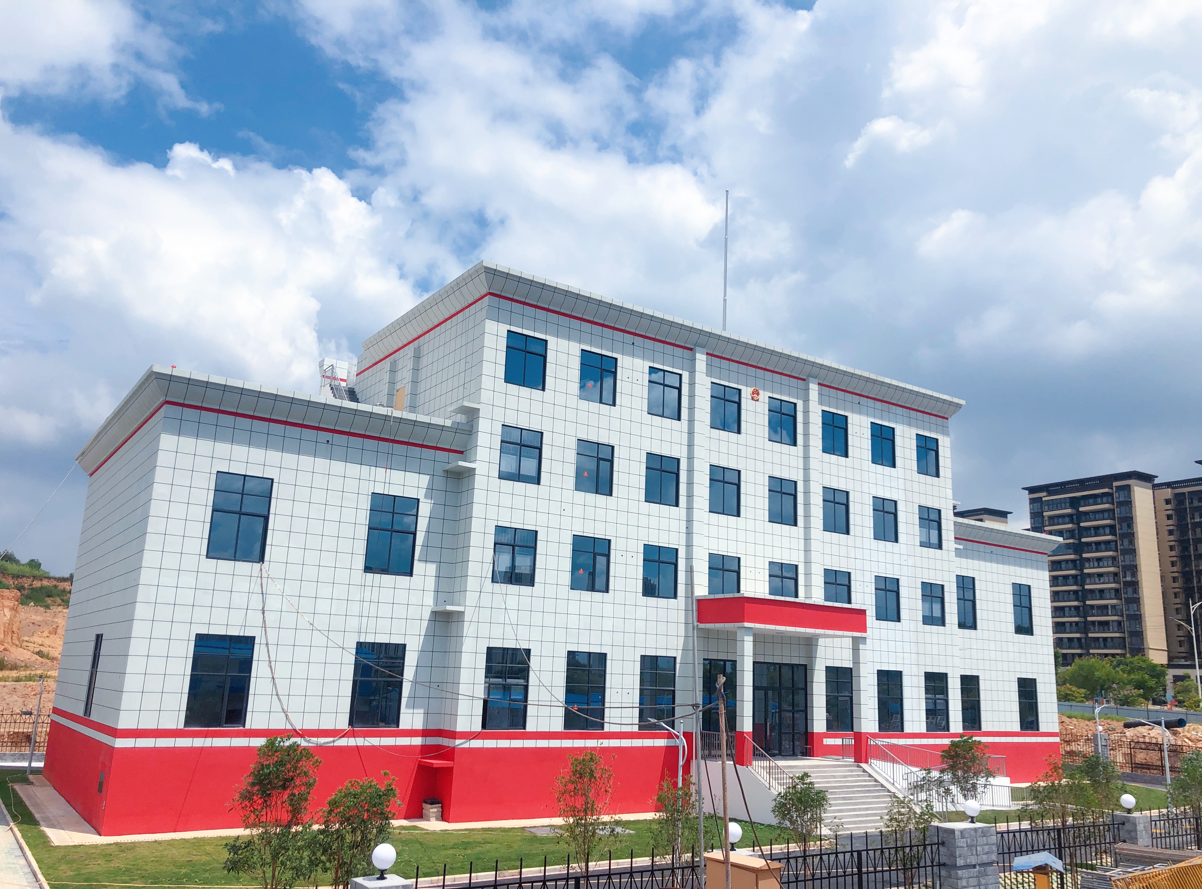 吴圩法庭回建工程是吴圩片区配套民生项目,为南宁经济技术开发区2022年城建计划重点实施项目。项目位于吴圩镇光明路西侧、6号路北侧,占地面积约8亩,总建筑面积3486.54㎡。主要建设内容为建设法院大楼,主要用于审批和办公;建设辅助用房,主要用于员工食堂及附属设施;总平配套工程等。项目自开工建设以来,科巨公司充分发挥建设铁军精神,积极协调各方攻克项目场地受限、变更手续繁复、资金紧缺、疫情影响、雨季施工等诸多困难;狠抓项目现场施工质量、安全文明施工管理、进度计划控制等主要工作,督促各参建单位加大人力、物力投入,全力以赴抓质量、抢进度、保安全,掀起整个项目现场建设的高潮,最终提前40天顺利完工,于8月6日顺利通过竣工验收该项目布局规整,建筑风格稳重庄严,体现法院的执法公正的特性,建成后将提升吴圩法庭的办公及服务环境,提高办公效率,为吴圩人民群众提供更好的法律服务场所和更优质的司法服务