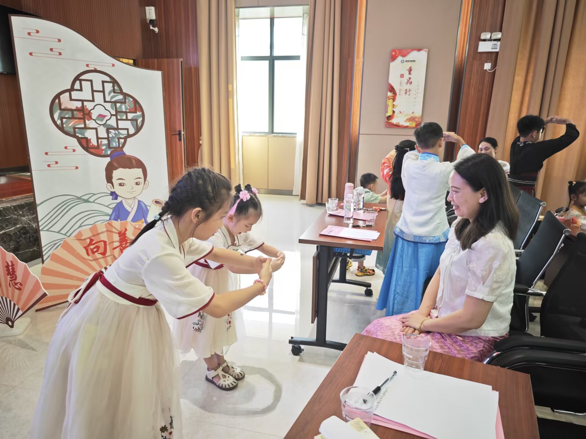 活动以传统礼仪的学习和体验为主题,此次培训邀请了广西经贸职业技术学院智慧商务产业学院的老师韦斯斯讲授少儿礼仪知识。活动中,韦老师向孩子们讲解了《弟子规》中学习的重要、做人的道理以及待人接物的礼貌常识,让大家更好地理解传统的礼仪。韦老师亲身示范,教授大家如何正确行认知礼仪、家庭礼仪、餐桌礼仪、待客礼仪、交往礼仪、入泮礼、作揖礼、孝道礼仪等,在抬手躬身中感受礼仪之邦的古韵,学习尊师重教的品德。韦老师结合理论知识学习,邀请孩子们上台实操演练,模拟情景表演、开展亲子互动小游戏等,孩子们纷纷上台,为大家展示,将学到的文明礼仪知识落实到行动中,培训现场生动形象、气氛热烈,孩子们全神贯注听取老师的讲解,依照老师的示范,认真的学习礼仪,体验传统礼仪。