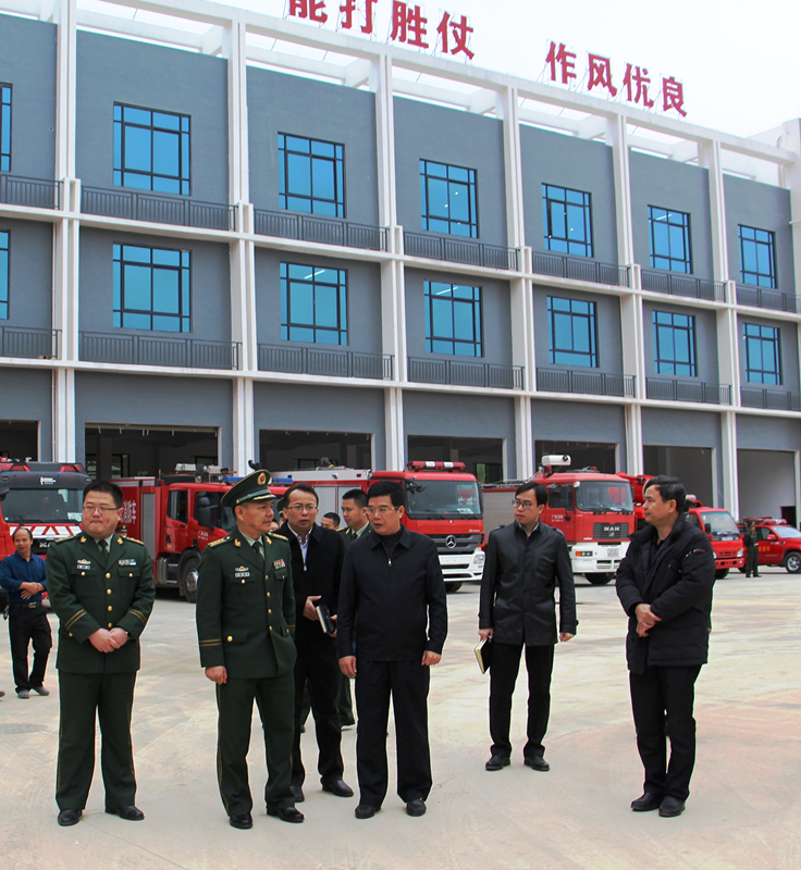 2月23日上午,南宁市消防支队支队长邓锡中在经开区党工委书记、管委会主任何尚汉、经开区消防大队大队长詹宁、华体会平台董事长杨东等领导的陪同下到华体会平台承建的吴圩空港新城消防站开展调研。